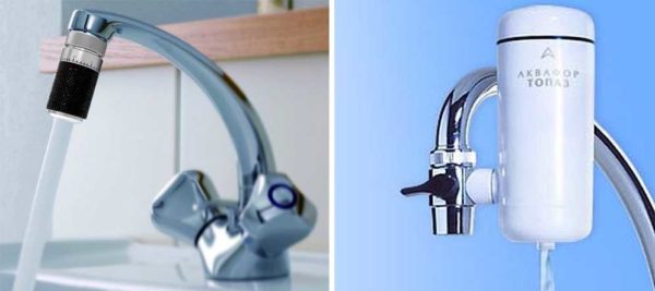 Очень компактный фильтр для проточной водопроводной воды, который надевается на кран. Скорость очищения — от 200 мл/мин до 6 л/мин. Степень очистки зависит от состава фильтрующей части, но обычно мало чем отличается от фильтров-кувшинов.