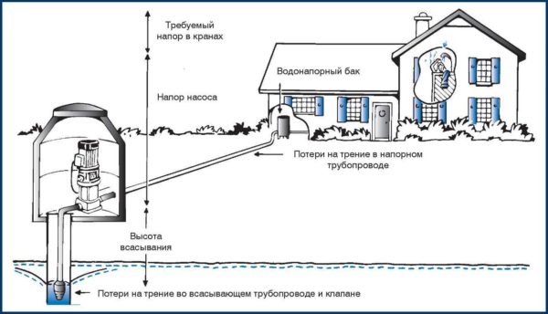 Подбирая насос для скважины, вы неминуемо будете изучать технические характеристики. Там есть такие параметры как высота подъема и глубина погружения. Высота подъема — называется еще напор — расчетная величина. Она учитывает глубину, с которой насос будет качать воду, высоту, на которую ее надо поднять в доме, протяженность горизонтального участка и сопротивление труб. Рассчитывается по формуле: