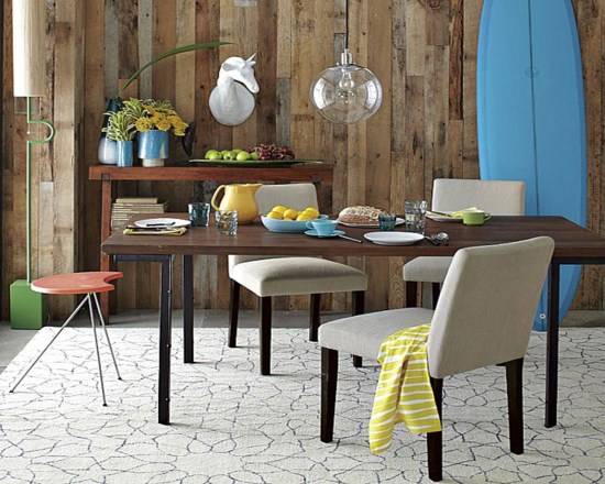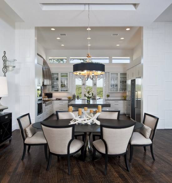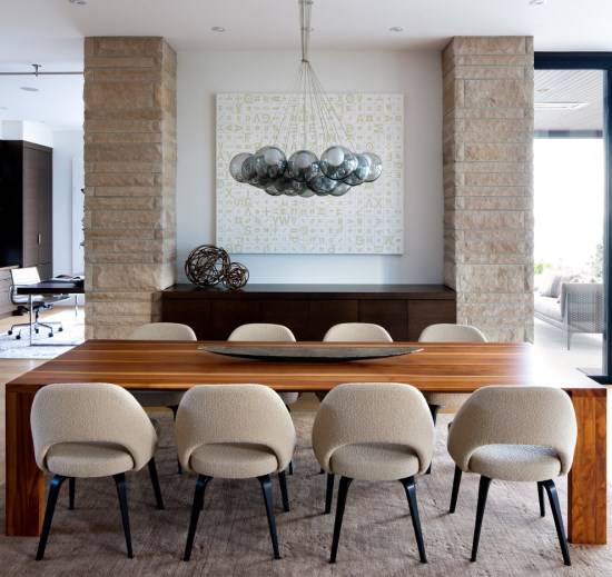 Смелый подвесной светильник, установленный над обеденным столом, является новой популярной тенденцией оформления гостиных и кухонь. В самом деле, когда красивая лампа висит достаточно низко, никакой декор для обеденного стола и не требуется. Более того, низкий светильник будет заманчиво подчеркивать сервировку стола, делая процесс приема пищи еще приятней.