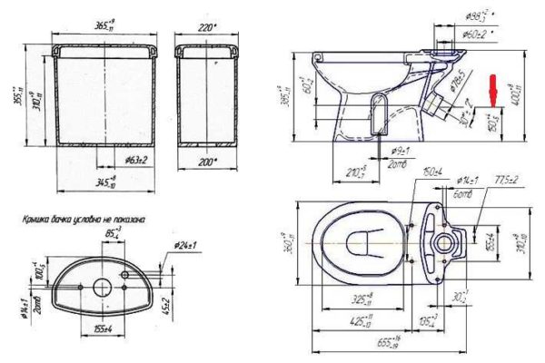 Техническая схема унитаза с размерами