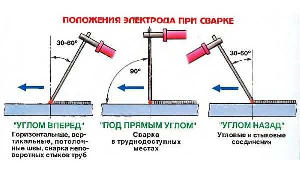 Чтобы металл меньше нагревался, детали ставят в вертикальном или хотя-бы наклонном направлении. Тогда варят сверху-вниз, двигая кончик электрода строго в этом направлении (не отклоняя и не возвращая). Угол наклона — углом вперед, при этом его величина 30-40°. Так прогрев металла будет минимальным, а это для сварки тонких металлов — одна из самых важных задач.