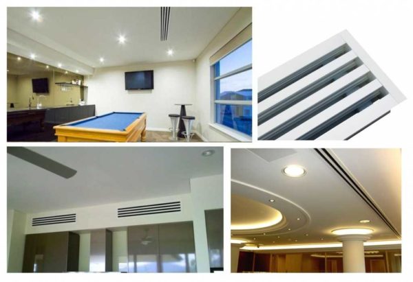 Иногда систему вентиляции прокладывают за подвесными потолками. В этом случае можно установить щелевые вентрешетки. Отличаются они размерами — длинные и узкие, подходят для установки в боковые поверхности подвесных потолков при небольшой их высоте.