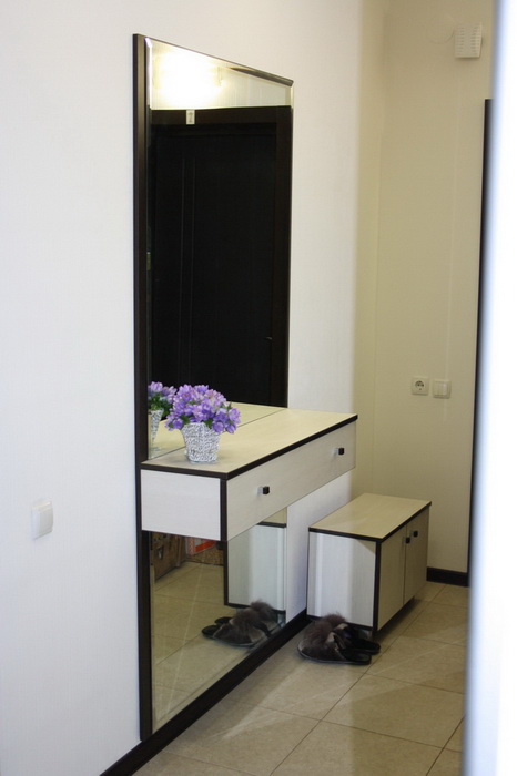Оформив входную дверь зеркальной вставкой, мы визуально удлиним нашу прихожую.