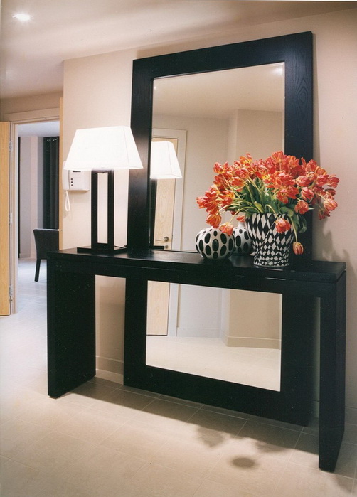 Большое зеркало в рост, в раме будет уместно даже в самой маленькой прихожей. Оно придаст пафосность интерьеру. Небольшая консоль не перекроет видимость.