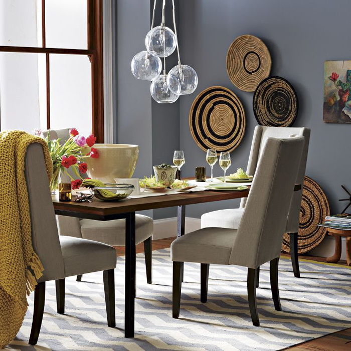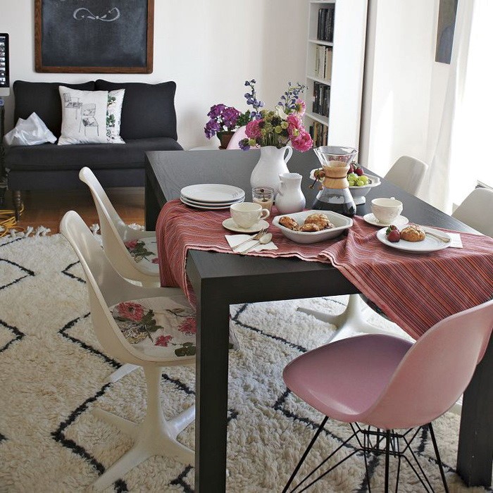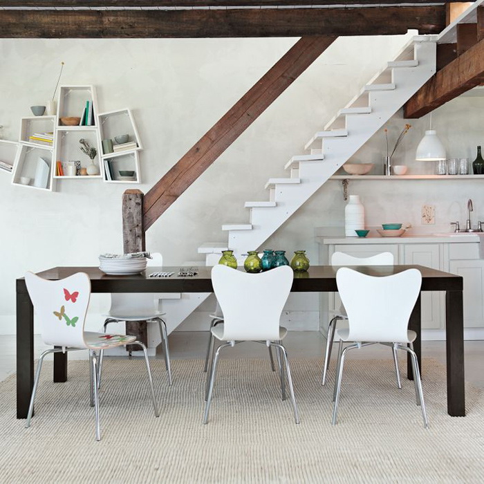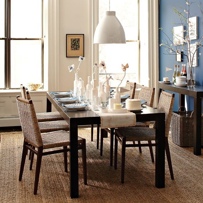 Здесь стол и каркасы стульев идентичны консоли, на которую можно временно поставить столовую посуду и другие кухонные атрибуты. Отделка спинки и сиденья стульев гармонирует с плетеными корзинами для хранения и ковром-циновкой. Все выдержано в едином эко-стиле.
