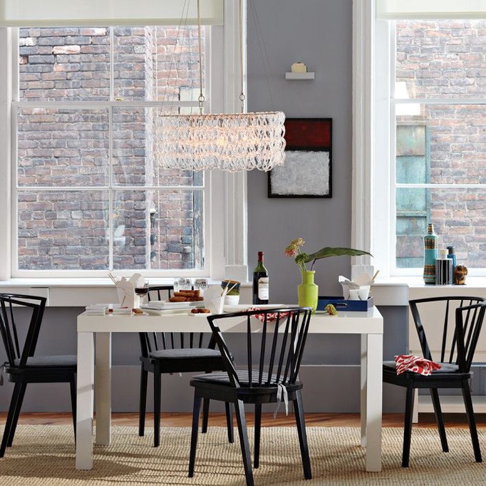 Строгий белоснежный стол органично дополняют черные деревянные стулья. Композиция со скандинавским характером будет актуально в любом современном интерьере от лофта до эко.