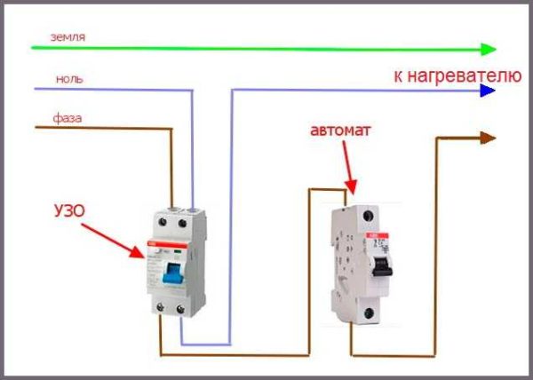 Подключение проточного электроводонагревателя стандартное — от щитка фаза из ноль заводятся на двухконтактное УЗО (обязательно разрывать и фазу и ноль), затем фаза заводится еще и на автомат и только после этого подается к потребителю.