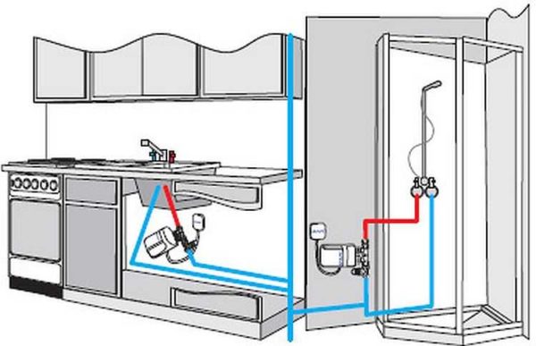 В частном доме такой агрегат будет работать при наличии насосной станции или собранной самостоятельно системы с гидроаккумулятором. Врезается он после всех фильтров, с выхода идет разводка на потребителей.