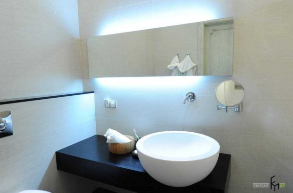 Для тех, кто хочет создать неповторимый дизайн ванной, есть еще одна интересная и пока мало используемая возможность — сделать подсветку в полу. Это сложная работа, но эффект получается очень интересный.