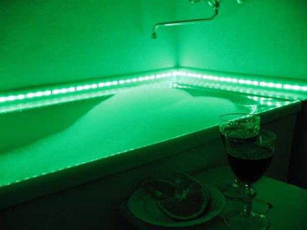Ванна — это не только утилитарное помещение для гигиенических процедур. В теплой ванне можно расслабиться, отдохнуть, снять стресс. Для таких случаев можно сделать подсветку. Для этого снова-таки используют LED-ленты (светодиодные), только не белые, которые берут для освещения, а цветные — для создания более мягкой атмосферы, способствующей релаксу.