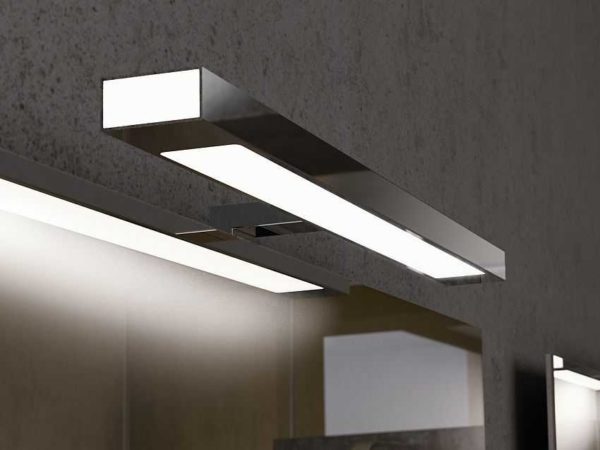 Потому имеет смысл ставить светильники для ванной комнаты над зеркалом или использовать влагоизолированную (в полимерной трубке) светодиодную ленту по периметру зеркала. Свет в таком случае распределяется равномерно, что удобно и для бритья и для косметических процедур.
