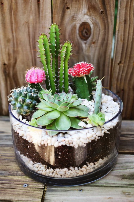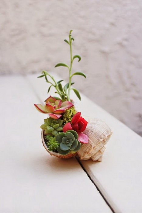 Комбинируйте суккуленты разных видов в одном горшке: круглые с длинными, остроконечные с плоскими. Кроме того существуют цветущие виды, которые обязательно порадуют вас новыми красками хотя бы раз в год. Вы создадите, таким образом, неповторимую композицию, которая обязательно привлечет к себе внимание.