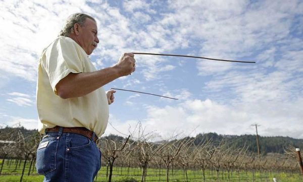 Подсохшую лозу берут за концы развилки, держат ее горизонтально на уровне плеч. В том месте, где под землей есть вода, часть ствола будет клониться к земле. В этом месте можно будет копать колодец или бурить скважину. Если отклонений нет — воды на участке на небольшой глубине нет.