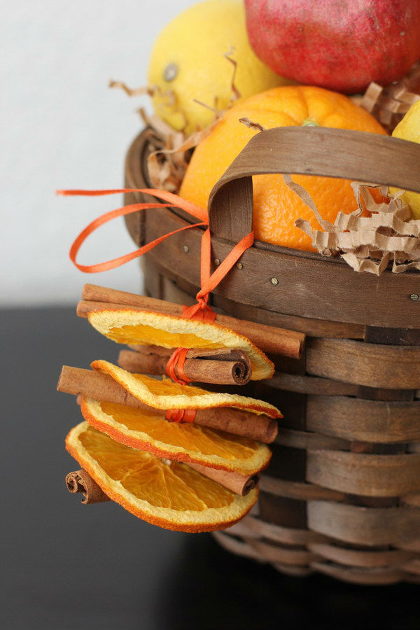 Тоже очень красивый способ декоративной подачи сушеных цитрусов. Берем корзинку небольшого размера, она может быть сплетена из ротанга, газетных трубочек или ивовой лозы, внутрь всыпаем апельсинки и украшаем сбоку веточкой ели и шишками.