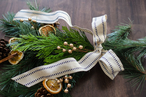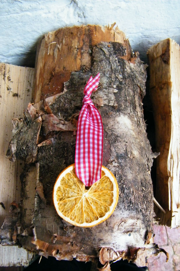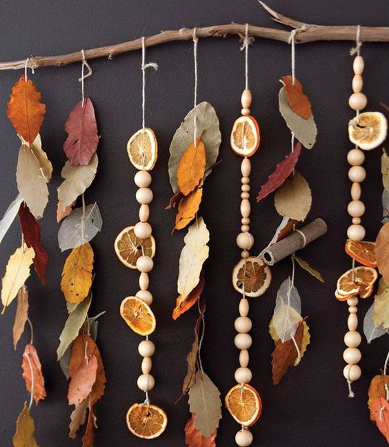 Можно просто продеть кружочки апельсина на ленточку, и завязать последнюю на узелок или бантиком. Также дольки цитрусового можно нанизывать горизонтально на вертикальную нить, чередуя с палочками корицы, высушенным горьким перцем, бусинами или листьями деревьев.
