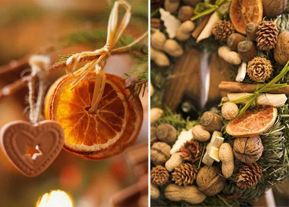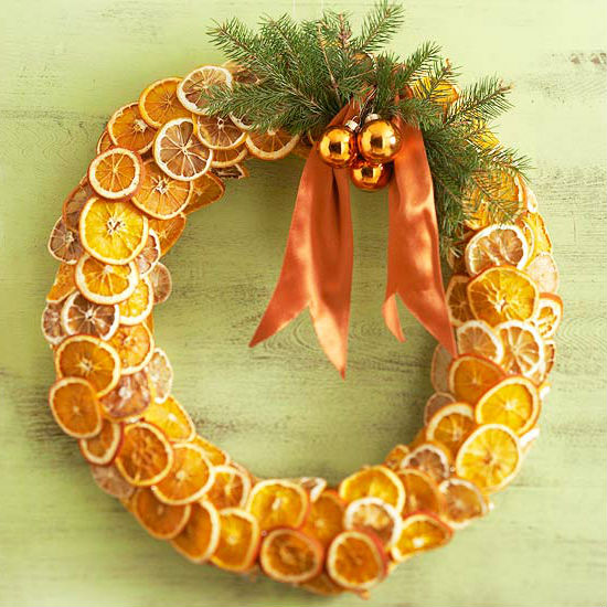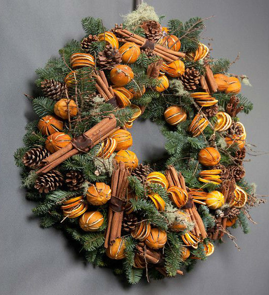 Кружочки апельсина можно закрепить на декоративном рождественском веночке путем приклеивания горячим пистолетом или просто подвязав леской или ленточкой. Готовые веночки смотрятся очень эффектно, особенно если их основа декорирована еловыми ветвями. Не менее красиво смотрятся веночки, полностью декорированные сушеными кружочками цитрусовых, и лишь где-то сверху дополненные еловыми веточками.