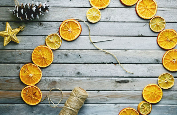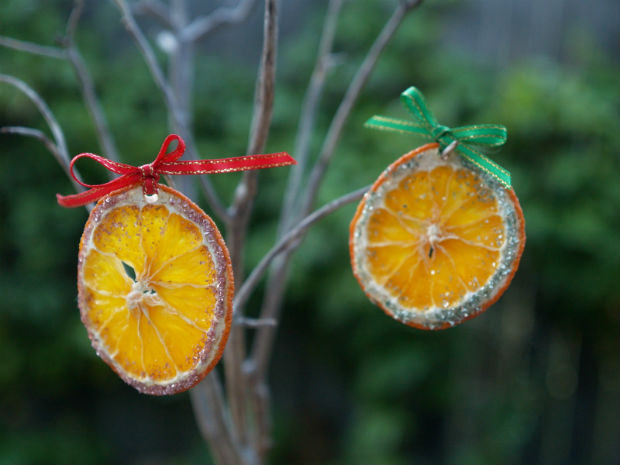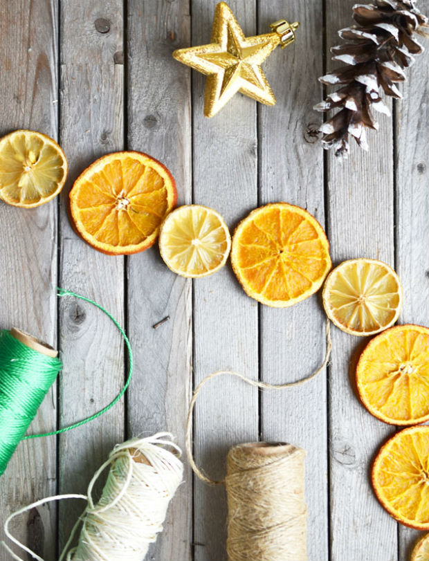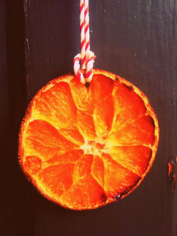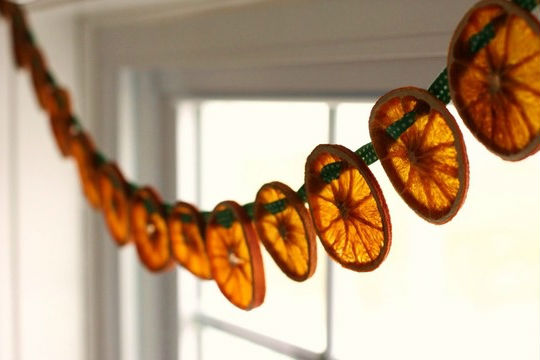 Берем плотную нить, шпагат, ленту или леску, и нанизываем на нее кружочки апельсина. Подвешиваем готовую гирлянду и раздвигаем апельсинчики на одинаковое расстояние друг от друга.