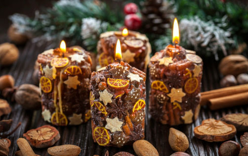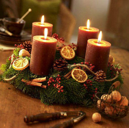 В целом, такие композиции могут состоять из целого ряда разных материалов: еловых веточек, шишек, орехов, каштанов, елочных игрушек, а также кружочков апельсина, ну и конечно же свечей. Очень красиво смотрятся белоснежные высокие и толстые свечи, так готовая композиция кажется более объемной и интересной.