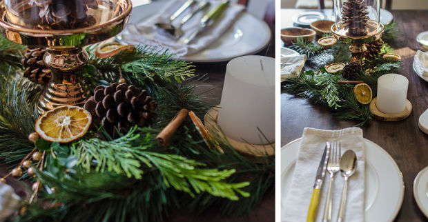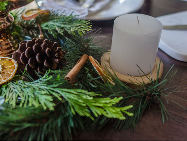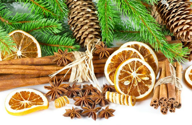 Такие композиции смотрятся очень красиво, к тому же источают невероятно приятные ароматы. А всего-то и нужно уложить на столе еловую ветвь, и уже поверх нее выложить апельсиновые кружочки. Чтобы готовая композиция смотрелась еще более ярко – украсьте еще красными искусственными ягодками.