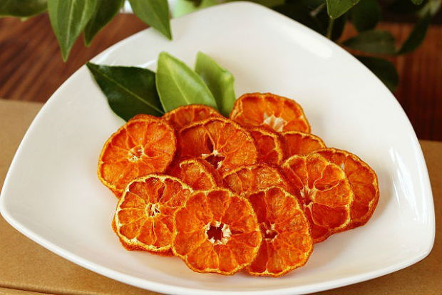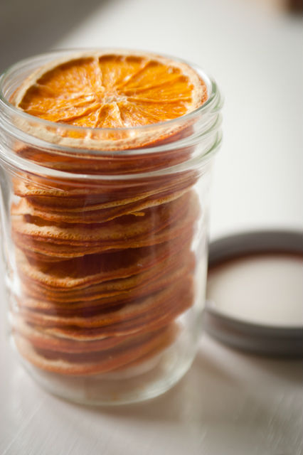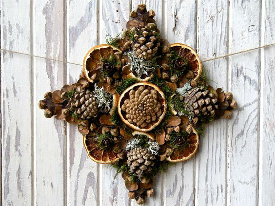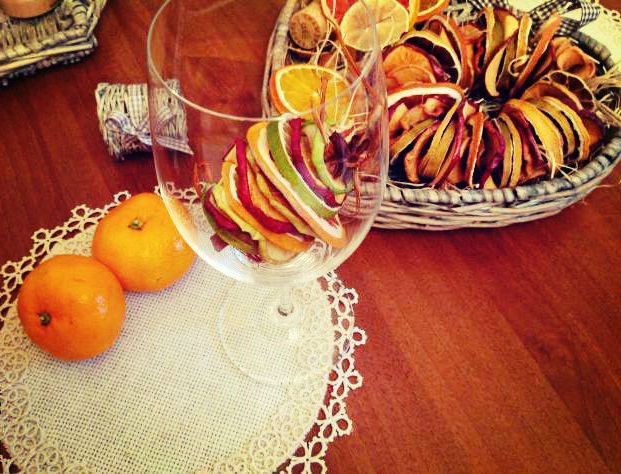 Дольки цитрусовых идеально будут смотреться в прозрачных стеклянных вазочках или просто баночках. Здесь не потребуется приложения массы сил и затрат времени, нужно элементарно всыпать высушенные кружки фруктов в баночку. По желанию сюда же можно вложить небольшую веточку ели, парочку шишек, грецких или лесных орехов.