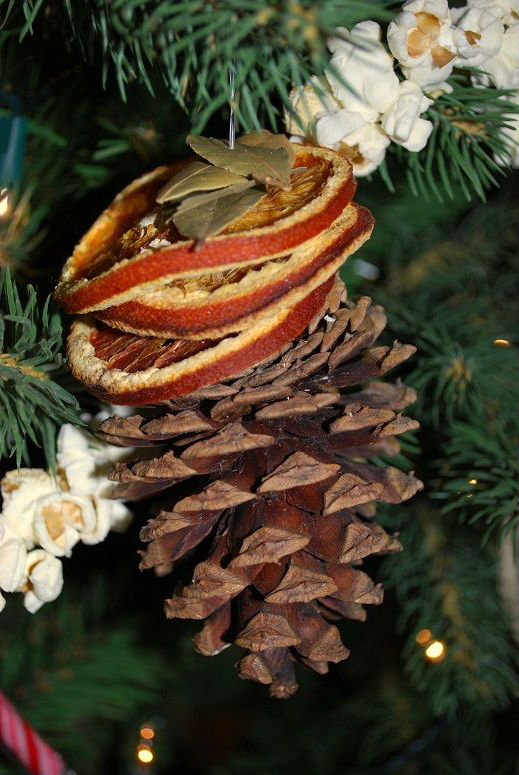 Апельсинки и шишки можно просто насыпать в вазу или сделать тематические елочные украшения, как на фото ниже.