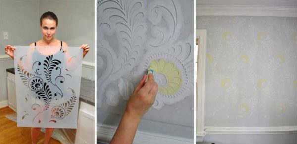 Подходящий трафарет закрепляют на стене. Проще всего это сделать при помощи малярного скотча. Краску наносят при помощи обычной губки (можно использовать кухонную). На губку берут немного краски, распределяют ее равномерно по всей поверхности (в качестве палитры подойдет пластиковая тарелка). Этим «орудием» прокрашиваем стену в прорезях. Так как краски немного, сохнет она быстро.