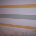Еще вариант — нанесение полос другого цвета. Чаще — полосы вертикальные, что помогает визуально «поднять» потолок. Они обычно разной ширины, расположены на разном расстоянии друг от друга, но это — далеко не канон. Варианты бывают разные. Несколько — на рисунке ниже.