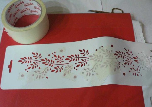 Если хотите получить двухцветный орнамент, части, которые будете красить в другой цвет заклейте скотчем (тоже малярным). Нанесите узор одним цветом, подождите пока краска высохнет. Заклейте эти части скотчем и добавьте недостающую часть другим цветом.
