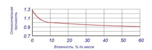 При отделке любыми материалами, которые монтируются на обрешетку или направляющие между отделочным материалом и стеной остается зазор. Его называют вентиляционным, так как в этом промежутке при правильном устройстве, идет активное движение воздуха снизу-вверх. Правильное устройство — это наличие отверстий в отделочном материале внизу и вверху. Это обеспечивает движение потока воздуха снизу-верх. Этот поток уносит с собой влагу, которая выводится из помещения. Такое устройство решает проблему конденсата, а также поддерживает нормальную влажность стен. Так как при повышенной влажности газобетон имеет более низкие прочностные характеристики, поддержание его нормальной влажности способствует более длительному сроку «жизни». Зависимость прочности газобетона от процентного содержания влаги представлена на графике.