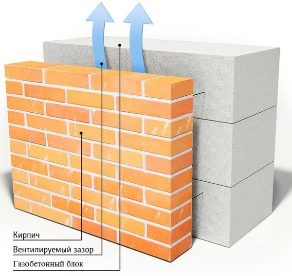 Если обложить фасад из газобетона кирпичом правильно, стоять он будет без проблем десятилетиями. Обязательное условие — между стеной отделочного материала и стеной из газобетона должен быть вентзазаор. Его ширина не менее 30 мм. Для того, чтобы он работал, при кладке отделочного кирпича в нижней части оставляют продухи — небольшие отверстия, В которые будет заходить воздух. Чтобы в них не попадали животные, их закрывают вентиляционными решетками.