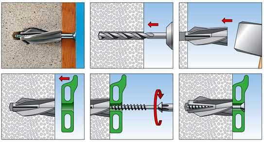 Способ установки стандартный. Под пробку дюбеля (пластиковую часть) сверлится отверстие. В нее в зависимости от формы винтовой поверхности вбивается (на фото верхний дюбель) или вкручивается (нижний) пластиковый вкладыш. После чего вкручивается винт.