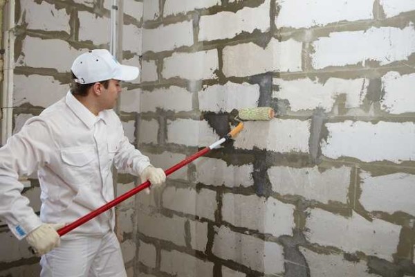 • Снижаем гигроскопичность газобетона. Если нанести любую штукатурку на неподготовленный блок, она не успеет «схватиться», так как газобетон очень быстро впитает всю влагу. Слой просто рассыпется. Потому сначала стены очищают от пыли, потом покрывают грунтовкой глубокого проникновения. Требуется два слоя. Первый сохнет примерно сутки (зависит от влажности и температуры).