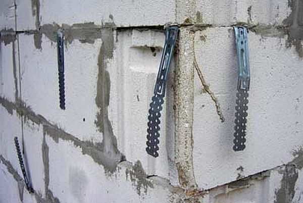 Но, если просто поставить стенку из кирпича на требуемом расстоянии от стены дома, очень велика вероятность того, что она просто упадет. Потому необходимо связать стены из пенобетона и кирпича. Для этого, еще на стадии укладки пенобетона, между блоками устанавливают тонкие пластины, которые называют «гибкие связи». Лучше всего — если они из нержавейки. Среда в растворе, в который утапливаются эти полоски имеет щелочную реакцию, а в щелочной среде металл, даже оцинкованный быстро разрушается.