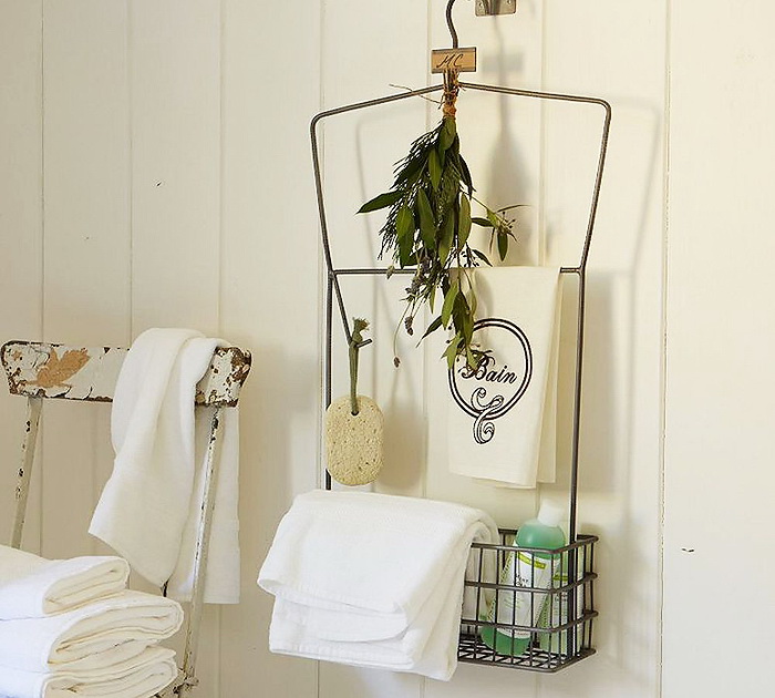 Полотенца красиво можно повесить не только на металлические конструкции. Для этого можно приспособить даже обычную самодельную лестницу из деревянных сучков или «бабушкин» стул с удобной спинкой.