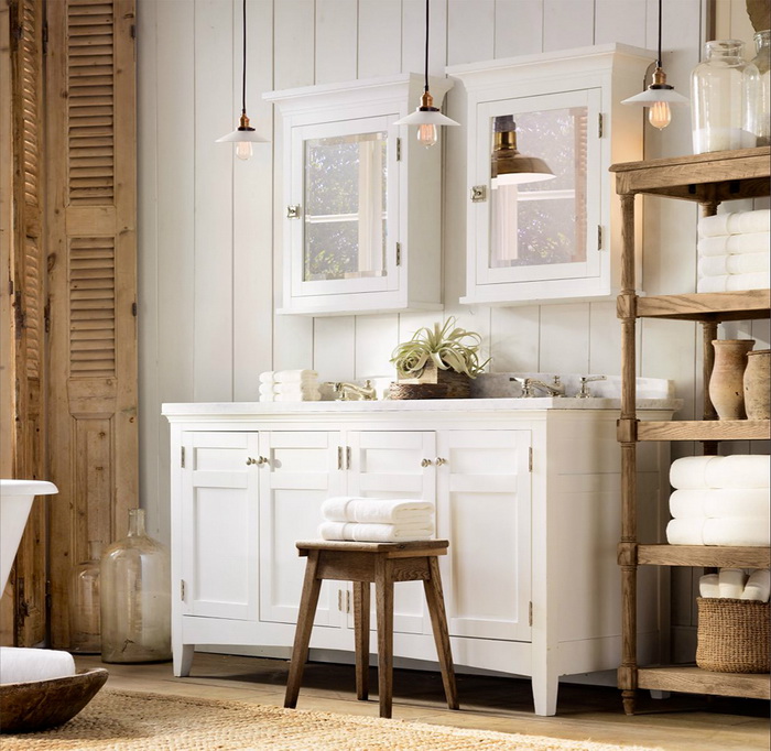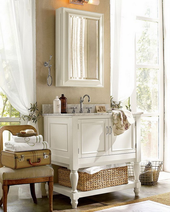 Классические белые шкафчики в стиле прованс поддержат общую цветовую гамму. Навесные конструкции со стеклянными дверцами пригодятся для хранения многочисленных баночек и других косметических штучек.