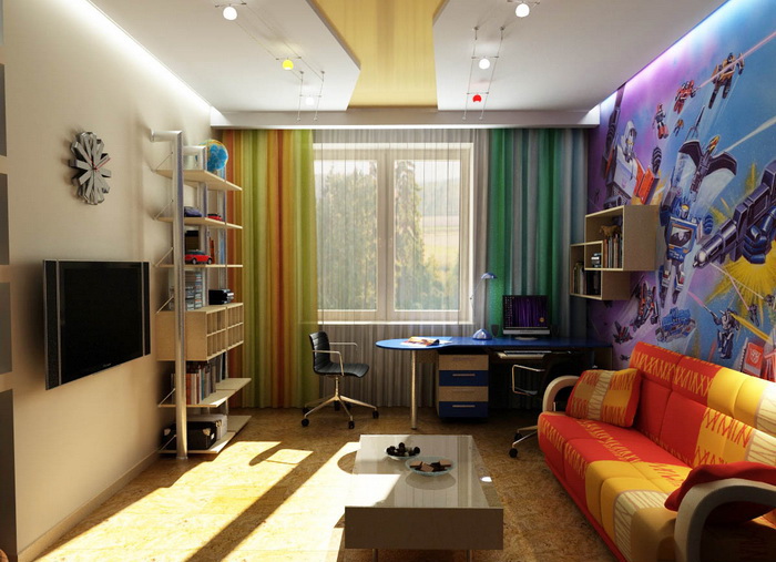 Обновить интерьер детской поможет дополнительное освещение, и пусть оно будет, только, для свободного времени. Разноцветные светодиодные ленты закрепите на мебели, сверху или снизу, за карнизом для штор. Ребята сами будут выбирать нужную цветовую гамму.