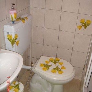 - В случае необходимости можно кое-где подправить рисунок тонкой кисточкой или соскрести заметные излишки краски лезвием. В течение следующих 24 часов нельзя допустить попадания воды на покраску, также лучше избегать в это время и влажности воздуха в ванной.