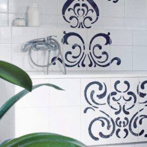 Намного проще разукрасить плитку орнаментом с помощью трафарета. Его можно купить или сделать самому из картона, но лучше из ненужного пластикового скоросшивателя. Для покраски можно использовать напыление автомобильной краской из баллончиков: она обладает мощным сцеплением и не требует предварительной грунтовки.
