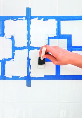 - Наклейка изоляционной ленты на плитки так, чтобы по краям и в середине нее получился нужный рисунок, в данном случае квадрат. Размещаем квадраты по уровню в 10 см друг от друга. Длинными отрезками изоляционной ленты оклеим стыки. При этом не стоит суетиться: в случае ошибки лента легко переклеивается,