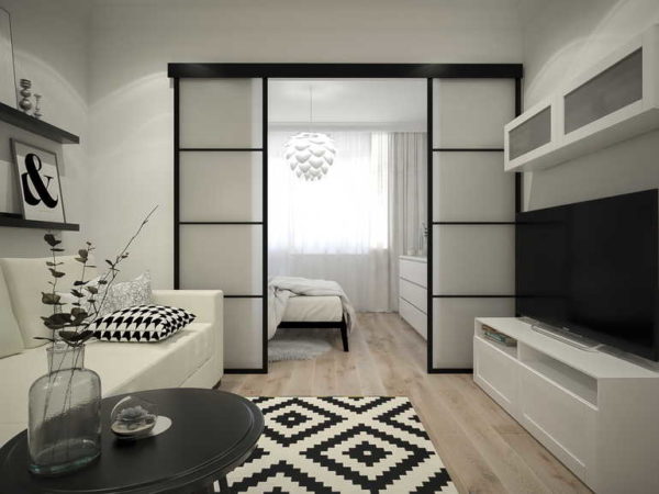 Гостиная спальня с разделением зон при помощи раздвижных ширм