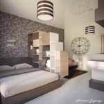 При таком решении настил должен быть достаточной высоты чтобы под него можно было спрятать кровать. Для такого решения идеально подходят длинные и узкие комнаты, которые еще называют вагончиками.