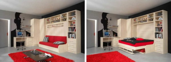 Если гостиная спальня небольшая (меньше 16 квадратов) или установить кровать и диван не представляется возможным из-за особенностей планировки, решение есть в единственном варианте — использовать мебель-трансформер. Если площадь позволяет, можно использовать любой из способов.
