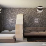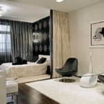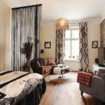 Еще более недорогой способ — гостиная спальня разделенная на зоны шторами. Все что требуется — выбрать и закрепить карнизы для штор. Потом — подобрать ткани и сшить полотнища нужных размеров. Ткани используются такие же как и на окнах и они не обязательно должны быть плотными, хотя и такой вариант возможен.