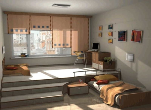 - Изменения уровня пола и потолка. Например, зону спальни можно немного приподнять, а чтобы разделение еще более акцентировать, использовать можно разное напольное покрытие. Оно может быть одинаковым по цвету, но разным по фактуре или материалу. Например, в зоне гостиной уложить ламинат, в зоне спальни — ковролин. Можно использовать и разные цвета.