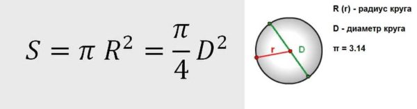 Провода в кабеле имеют в поперечном сечении форму круга. Потому при расчетах пользуемся формулой площади круга. Ее можно найти используя радиус (половину измеренного диаметра) или диаметр (смотрите формулу).
