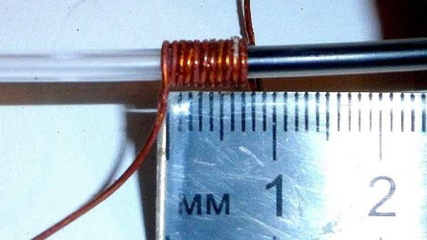 Количество витков не важно — около 10. Можно больше или меньше, просто на 10 делить проще. Витки считаете, затем прикладываете полученную намотку к линейке, совместив начало первого витка с нулевой отметкой (как на фото). Измеряете длину участка, занятого проводом, потом его делите на количество витков. Получаете диаметр провода. Вот так все просто.