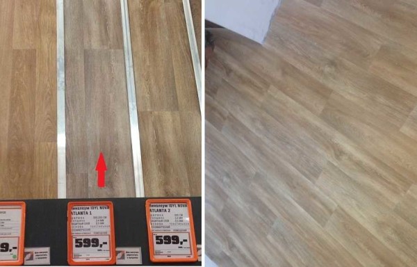 Ламинат в магазине и на полу в нашей кухне