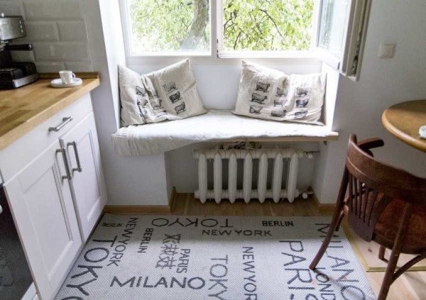 Кто-то умудряется поставить на этом небольшом пространстве даже диван. Решение неординарное, но, ка видите, тоже может быть реализовано.