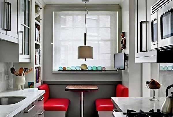 В узких, длинны кухнях, под окно можно вынести обеденную зону. Решение очень нестандартное, но и планировка такая тоже нечасто встречается. Тем не менее, идея интересная.