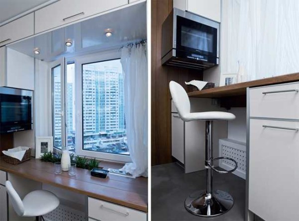 Что можно сделать на балконе/лоджии, совмещенных с кухней? Да что угодно. Можно сделать во всю ширину окна не очень широкий прилавок, расставить там высокие, но удобные стулья.